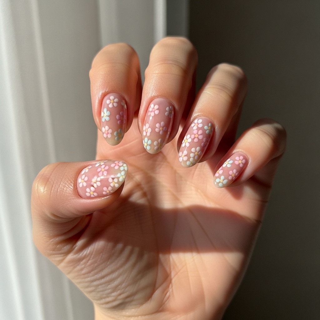 This design features tiny hand-painted flowers scattered across a nude or soft pink base. The florals are subtle, often in white, yellow, and pastel tones, creating a barely-there artistic effect. It feels stylish due to its intricate detailing while remaining understated. Ideal for daytime events or garden parties, it complements soft spring outfits beautifully. The lightweight design ensures comfort, while the fine detailing keeps it trend-forward and elegant.