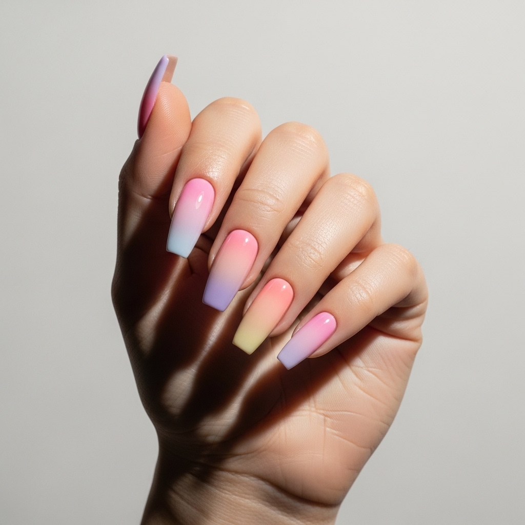 A seamless gradient blending pastel shades creates a soft ombre effect across each nail. Colors like pink, peach, and lavender melt into one another for a dreamy finish. This design is stylish because of its smooth transition and gentle color play. Perfect for both casual and semi-formal settings, it feels versatile and modern. The absence of heavy details ensures comfort, while the gradient effect keeps it visually interesting.
