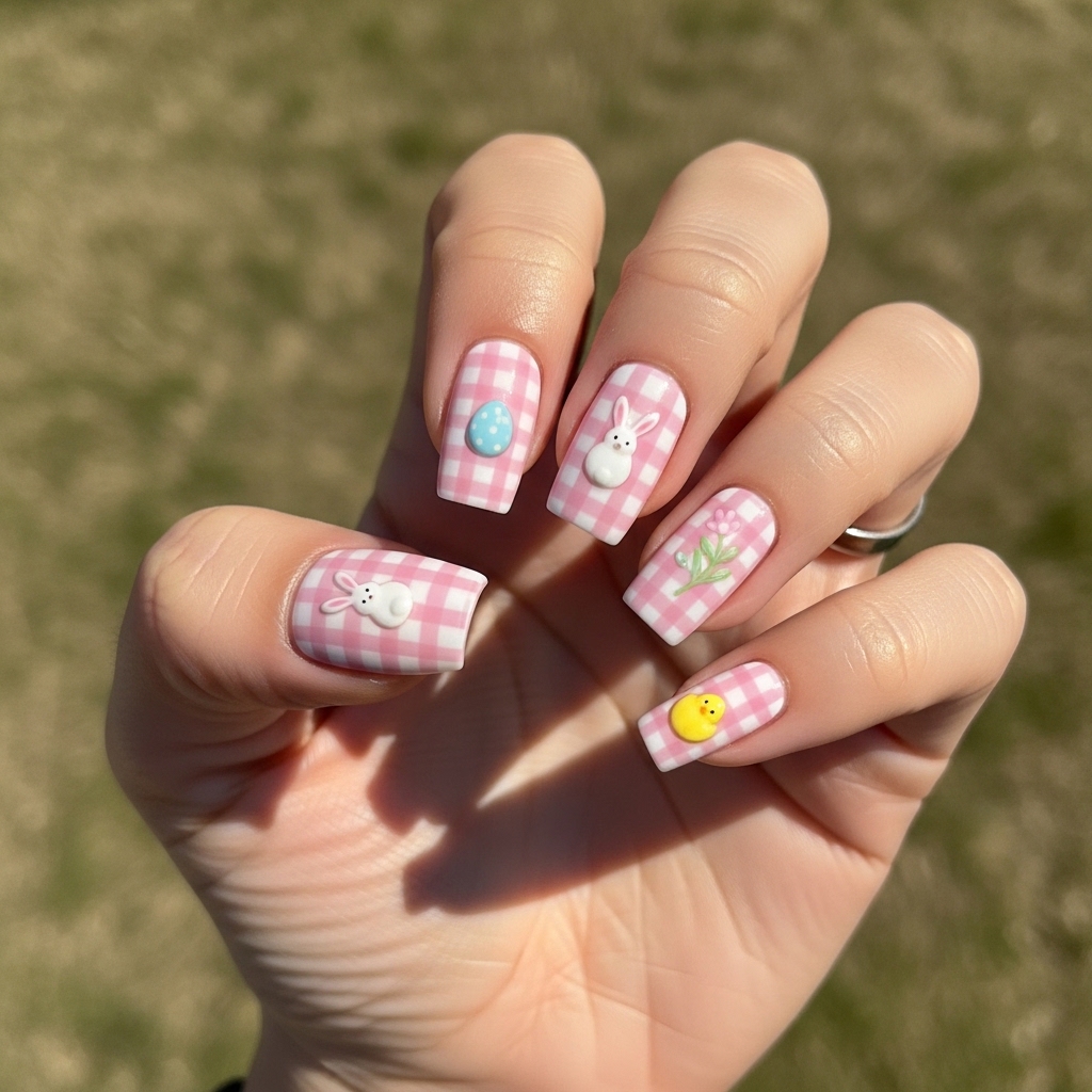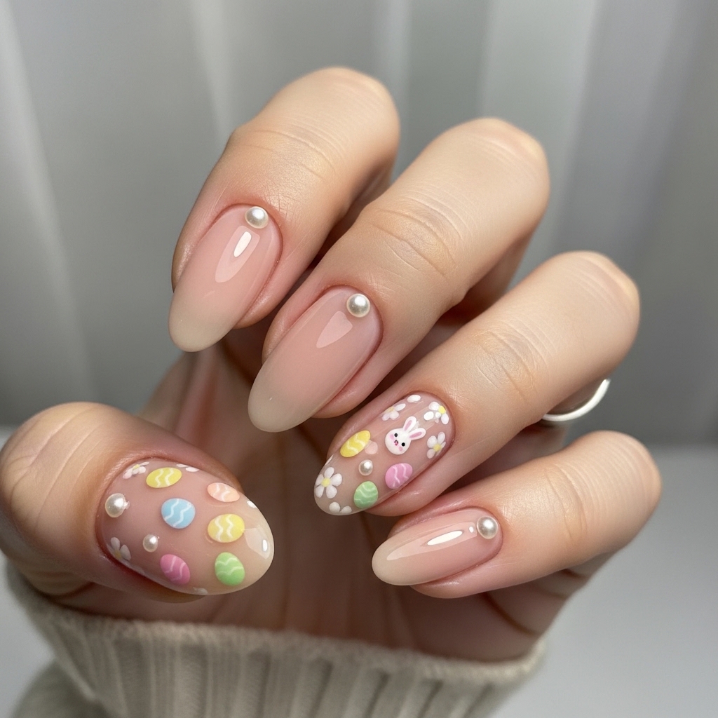 This playful yet refined design keeps most nails neutral while featuring a small bunny illustration on one or two accent nails. The base is usually a soft nude or pastel shade. It is stylish because it adds a seasonal motif without overwhelming the overall look. Ideal for casual celebrations, it balances fun with sophistication. The minimal detailing ensures comfort, while the accent keeps it trendy and festive.