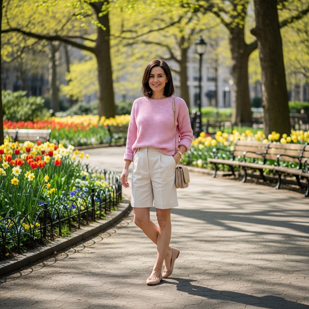 Pastel knit sweaters combine spring softness with structured bottoms. Light pink, mint, or lavender sweaters pair beautifully with tailored shorts in cream or tan, creating a look that is both relaxed and polished. Minimal jewelry and neutral flats complete the outfit.