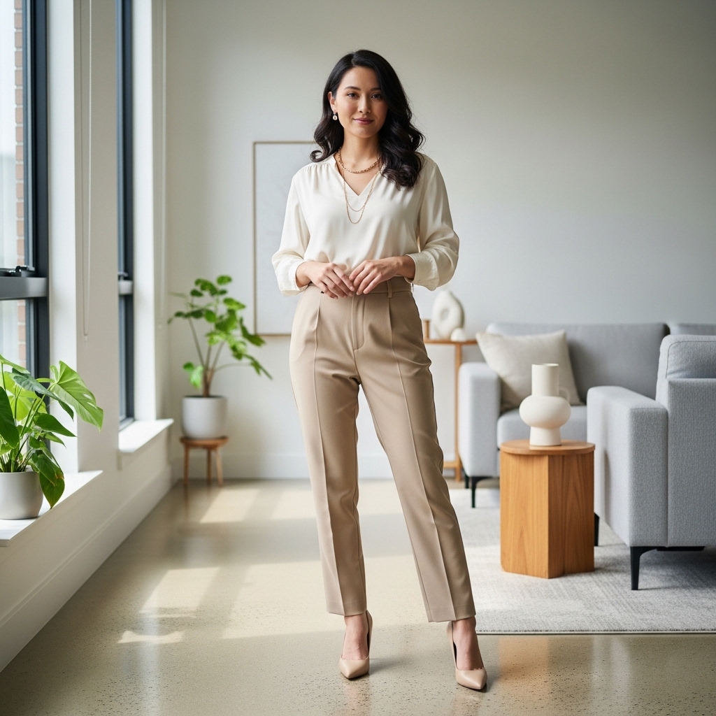 A monochrome cream outfit emphasizes sophistication through simplicity. Silk or cotton blouses paired with straight leg trousers create a fluid silhouette. Subtle accessories like a gold necklace or minimal clutch enhance the refined aesthetic.