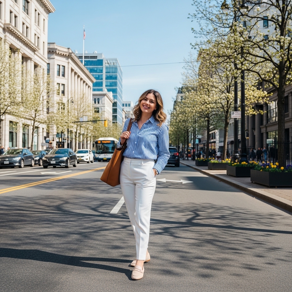 Ideal for casual workdays, weekend lunches, or spring city outings, this outfit blends structured elegance with relaxed comfort. Breathable fabrics in soft cotton or lightweight denim make it easy to move through a busy day. The combination balances modern trends with wardrobe staples, creating a timeless and approachable aesthetic.