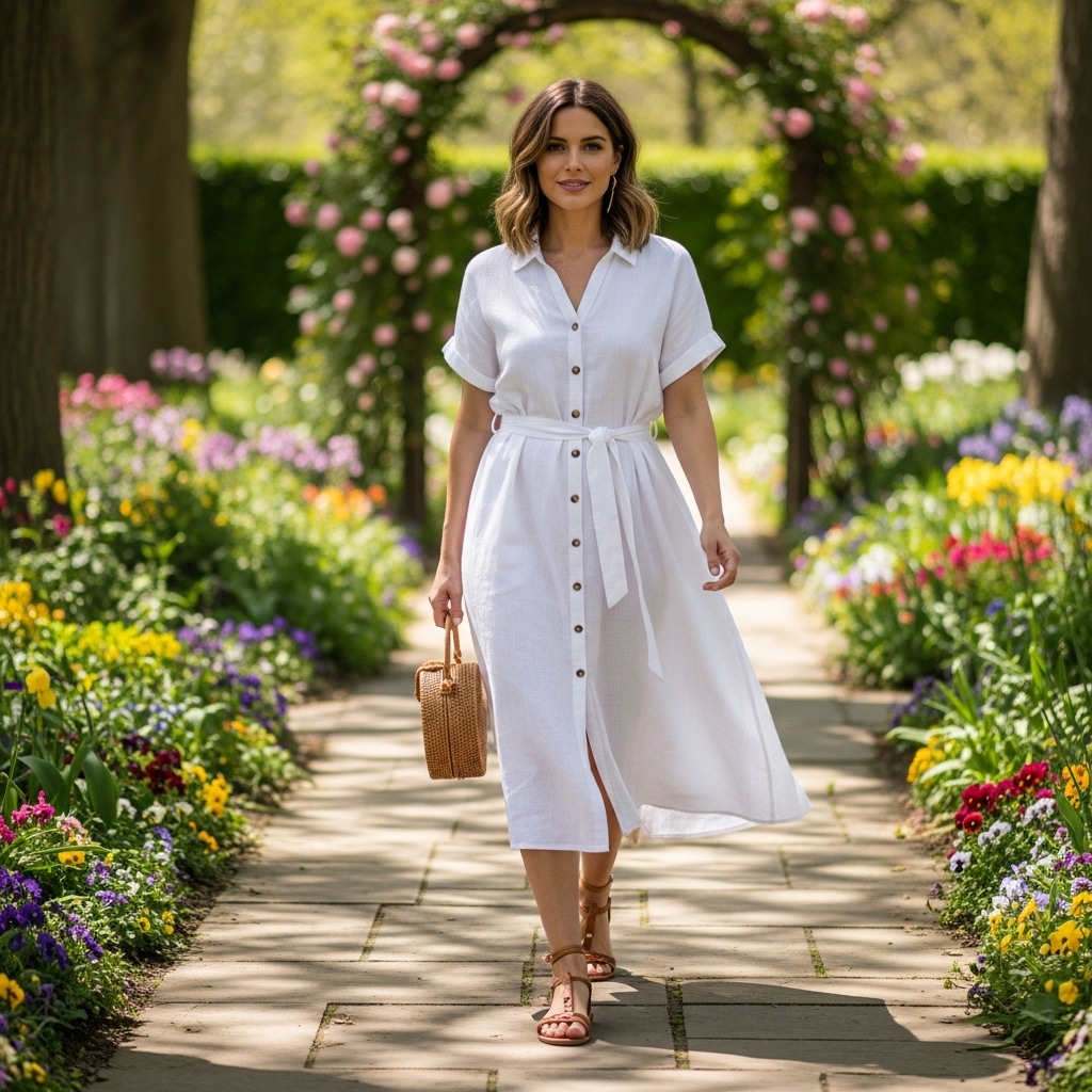 This style is ideal for brunches, garden walks, and casual spring gatherings. The linen fabric keeps the outfit cool, while neutral tones create a versatile, chic palette. Comfort is prioritized without compromising the refined look, making this a must for warm spring days.