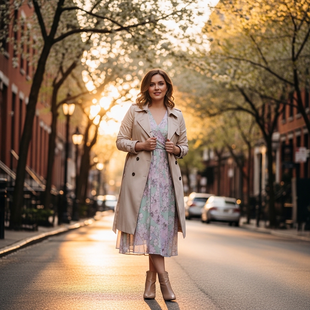 Lightweight beige trench coats layered over simple dresses elevate everyday spring looks. Paired with ankle boots or flats, this outfit balances practicality and elegance.