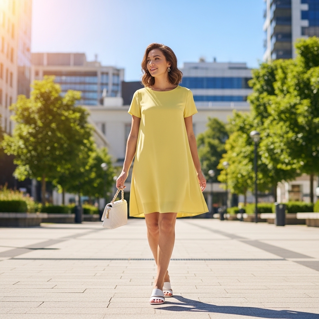Soft yellow shift dresses bring cheerful energy while maintaining minimalist charm. Simple A-line silhouettes allow freedom of movement and easy pairing with neutral accessories.
