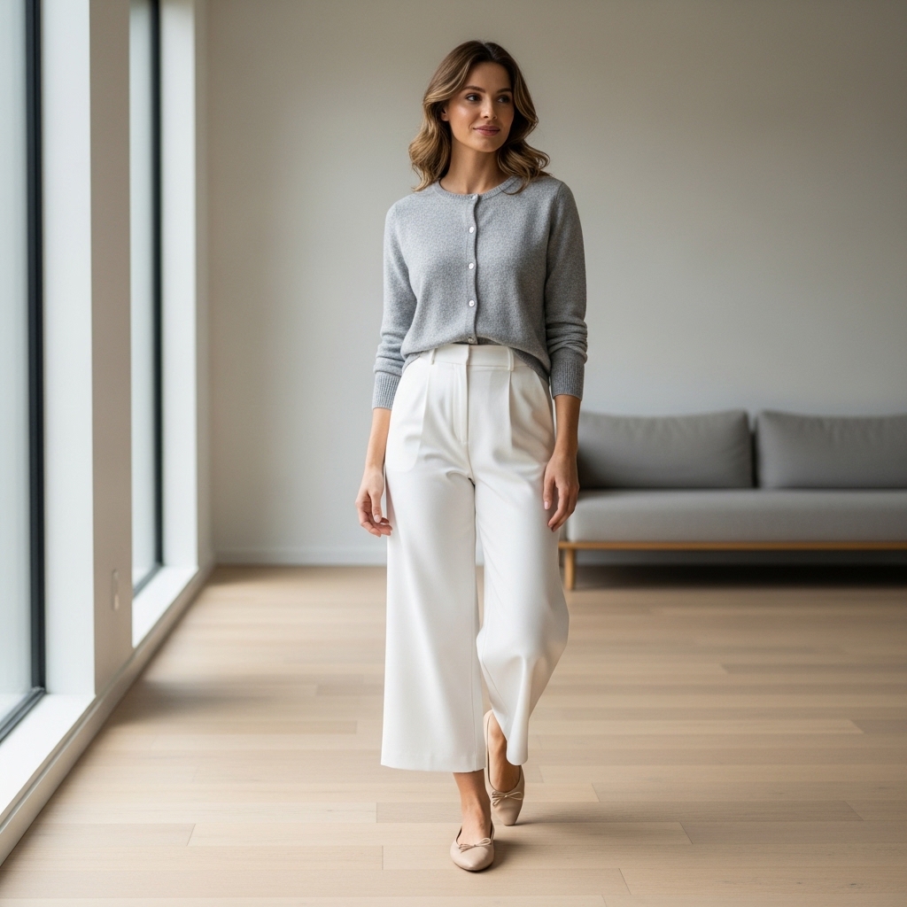 This look pairs soft gray cardigans with high waisted wide leg pants for effortless elegance. Neutral tones make the outfit versatile while relaxed tailoring ensures comfort.