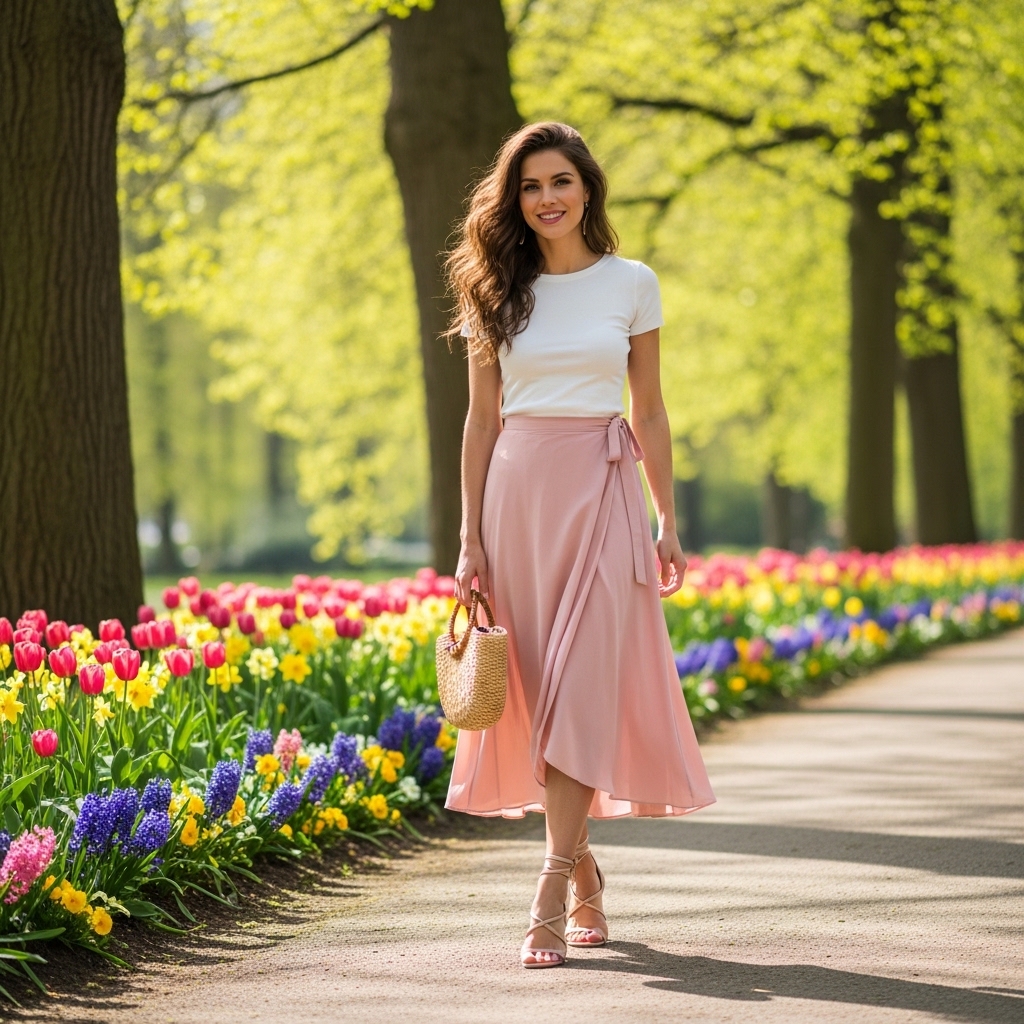 Blush wrap skirts paired with crisp white tops create feminine, airy spring outfits. Lightweight fabrics allow gentle movement while maintaining elegance.