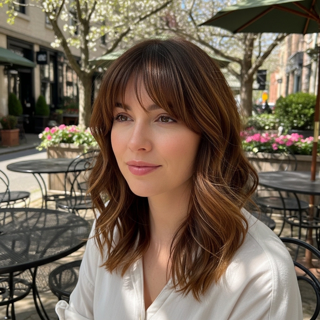 Curtain bangs return this spring with a lighter, more effortless feel. These bangs gently part in the middle and blend seamlessly into the rest of the hair, creating a soft frame around the face. They suit a wide range of face shapes and can be styled with loose waves or straight hair. Perfect for brunches, casual workdays, or outdoor gatherings, they add a romantic and youthful touch. Their versatility and low commitment styling make them both comfortable and fashion-forward.