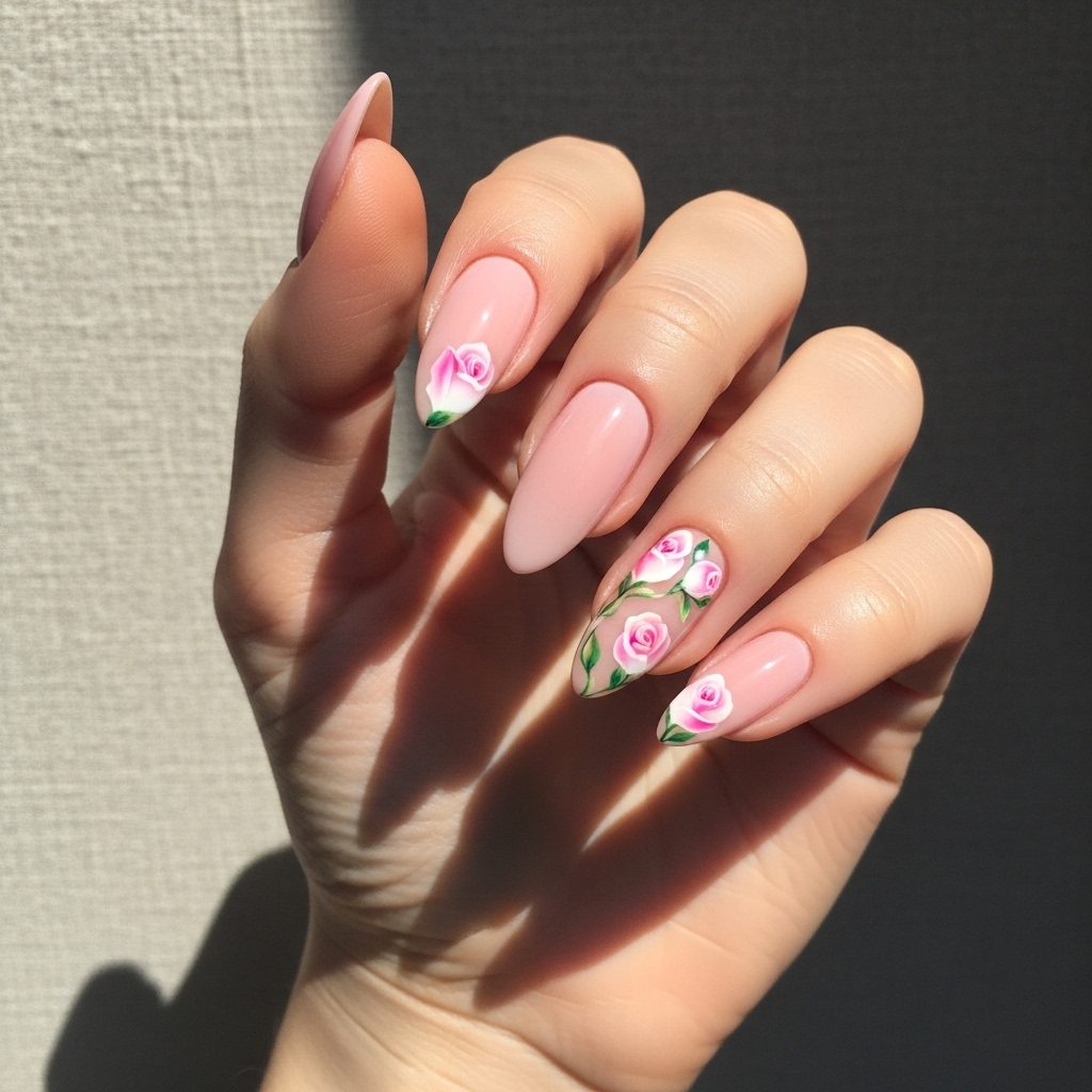 This manicure features soft blush pink almond shaped nails decorated with tiny hand painted rose petals. The base color remains sheer and glossy while two accent nails carry delicate floral clusters that look almost like miniature bouquets. The design keeps the overall look airy and refined.