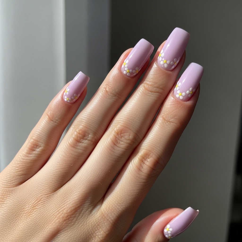 Lavender Bloom nails combine pastel lavender polish with delicate white flower illustrations placed near the cuticle area. The nails are shaped in a soft square style, giving the manicure a clean modern appearance while still feeling feminine.