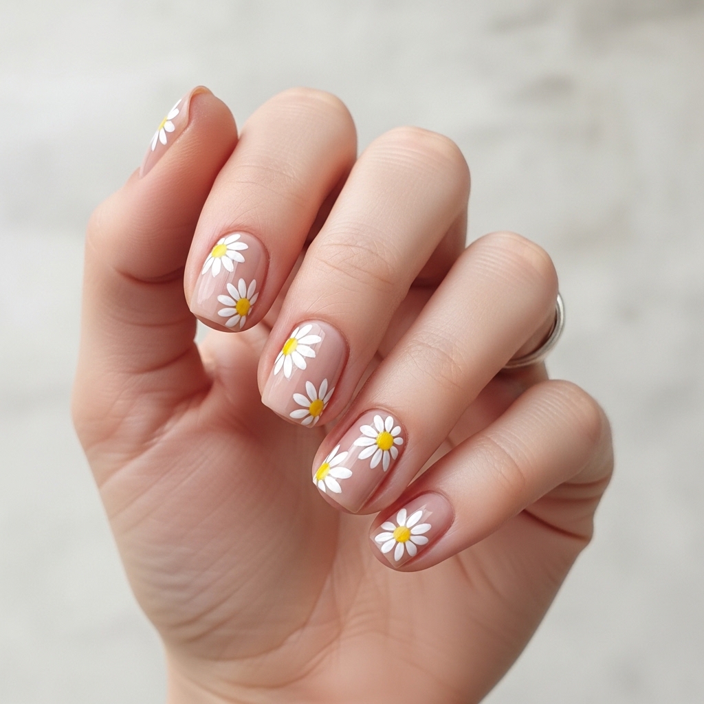 Daisy Meadow nails feature a creamy nude base with tiny white daisies scattered across the surface. The manicure is designed on short rounded nails, making it extremely comfortable while still visually charming.
