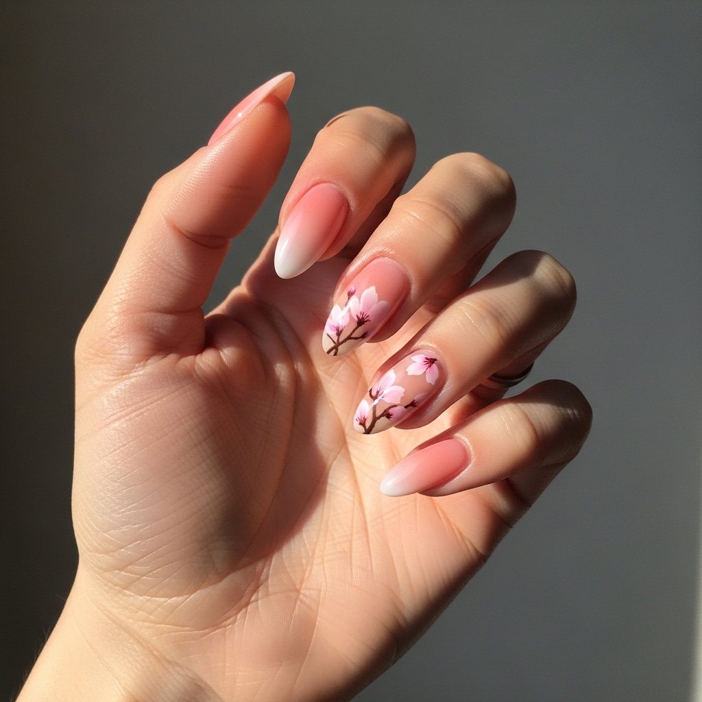 The gradient base creates dimension while the subtle floral accents keep the manicure refined. This design suits garden parties, spring celebrations, or elegant casual settings. The comfortable medium length almond shape allows both beauty and practicality.