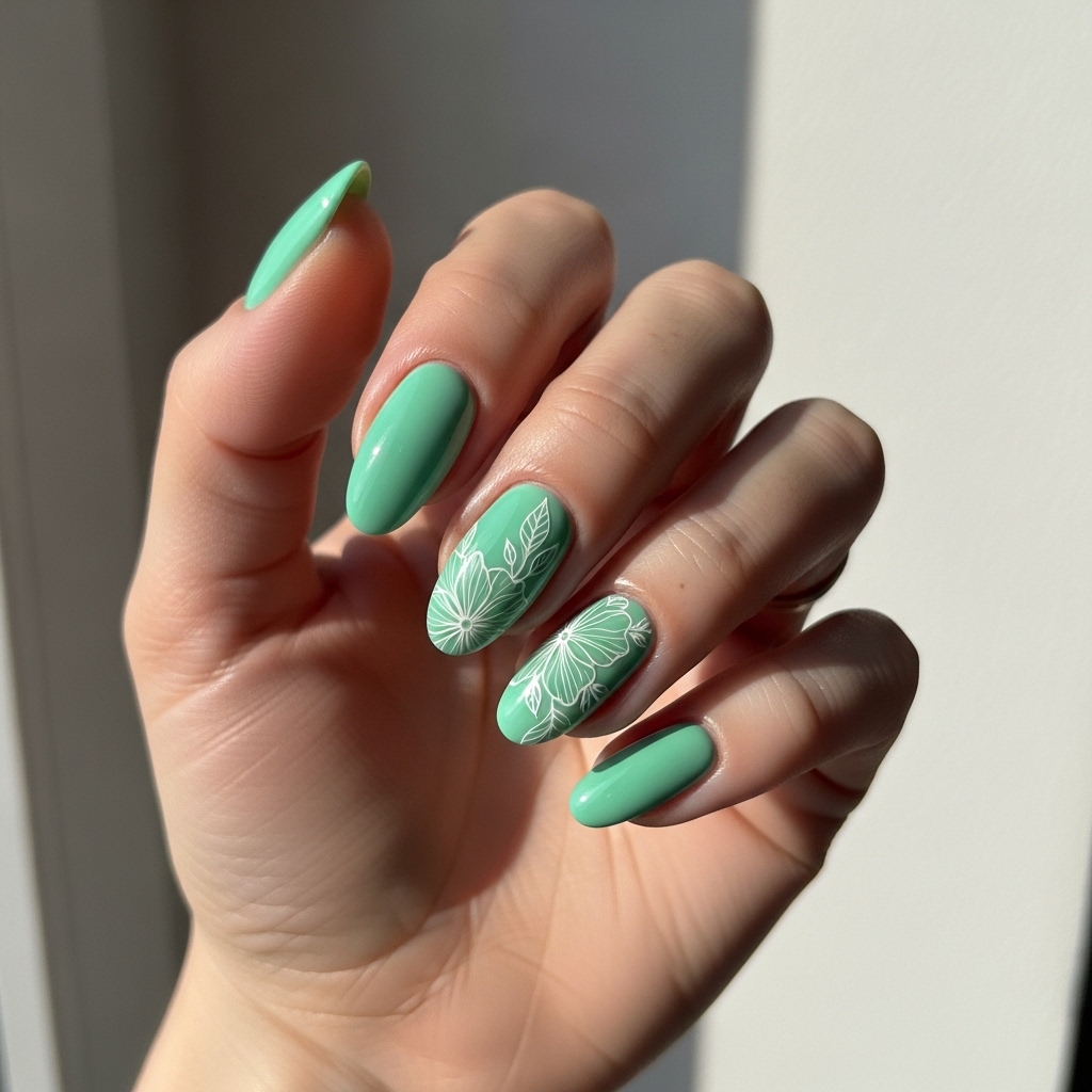 Mint Leaf Garden nails combine fresh mint green polish with minimal floral line art. Thin white petals and small green leaves appear across accent nails, creating a light botanical effect.