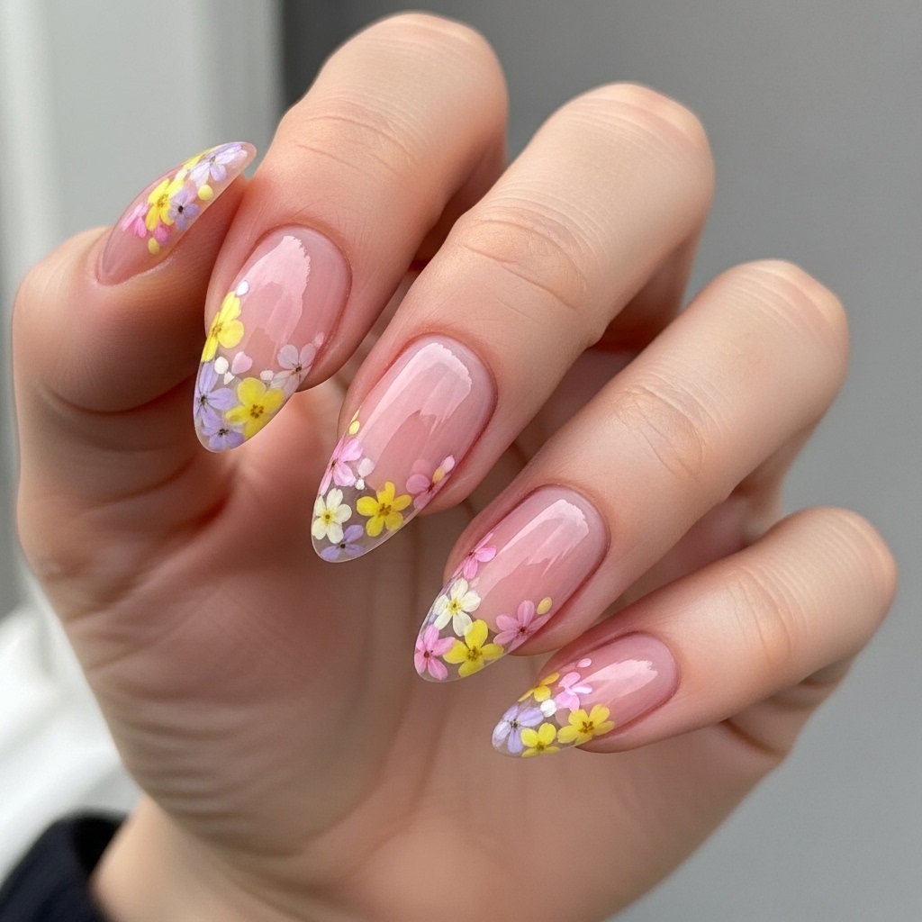 This design reimagines the classic French manicure with pastel floral tips. Instead of plain white edges, the tips feature tiny painted wildflowers in shades of yellow, pink, and lavender.