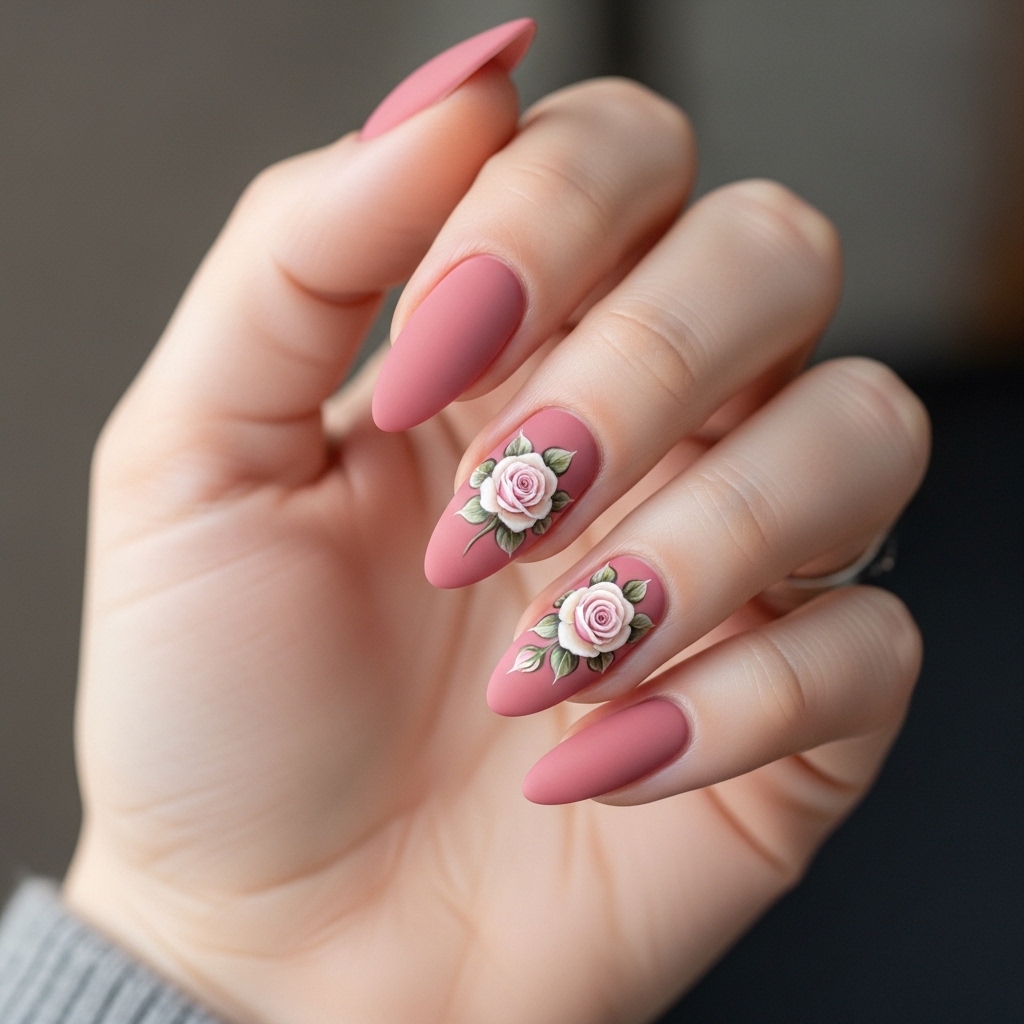 Soft Rose Garden nails feature dusty rose matte polish with hand painted floral clusters on two accent nails. The matte texture adds modern sophistication while the floral details maintain spring charm.