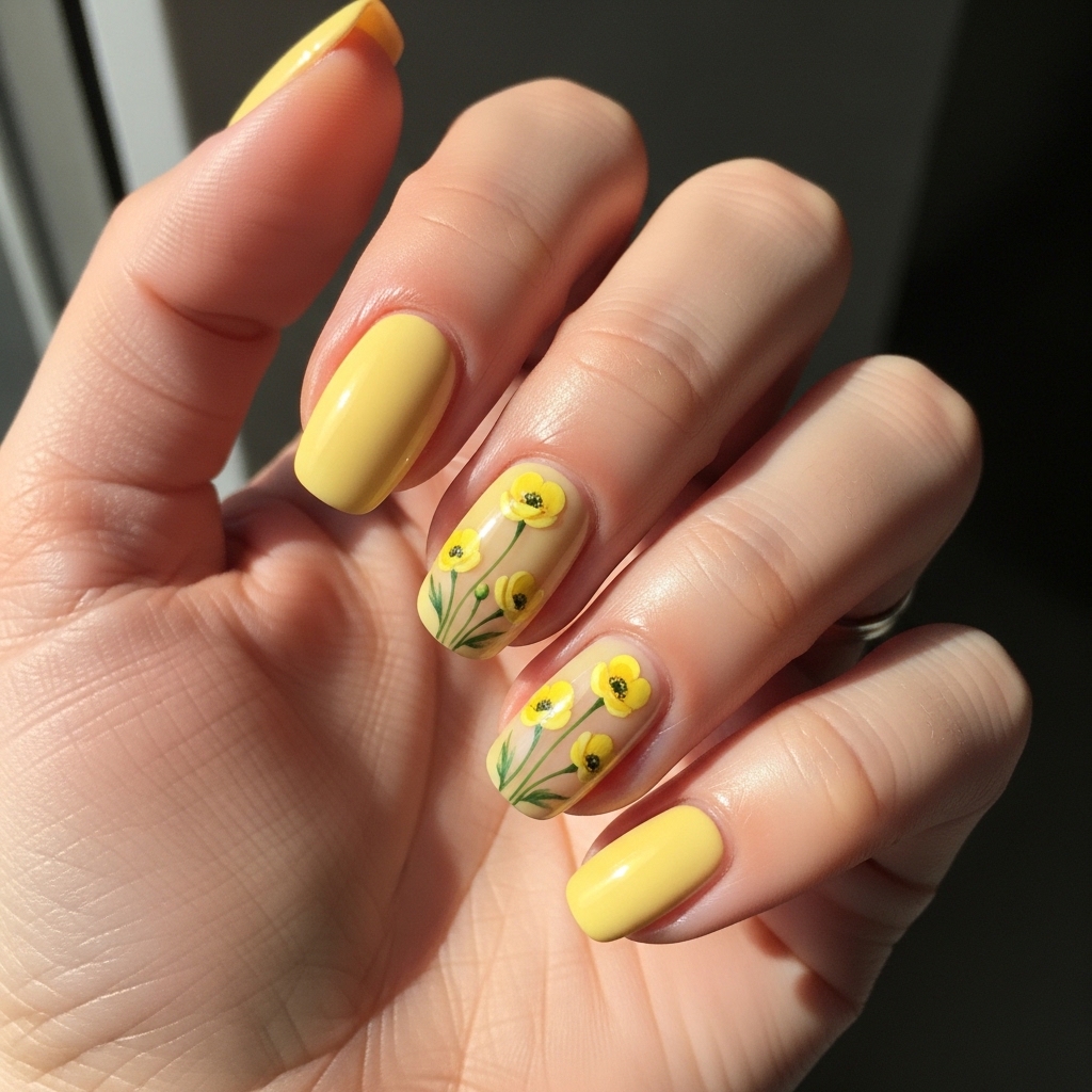 Buttercup Fields nails bring cheerful yellow tones paired with tiny buttercup flowers across accent nails. The bright color reflects the joyful mood of spring while the floral details keep the design artistic.