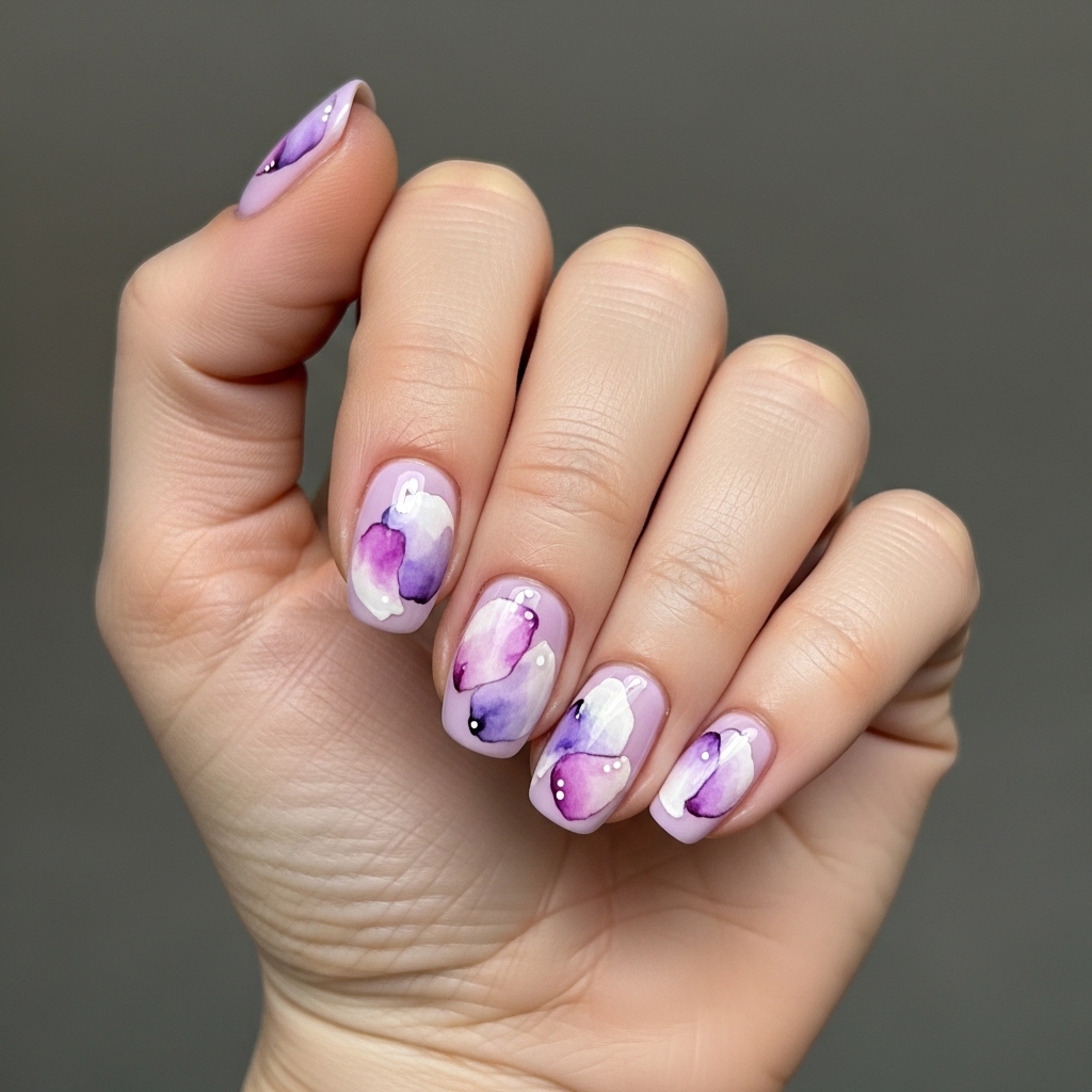 Lilac Watercolor nails feature soft watercolor style petals painted over a pale lilac base. The flowers appear slightly blended, creating a delicate artistic effect.
