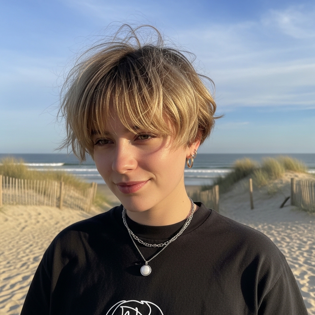 Featuring a soft sandy hue and a light fringe, this bixie leans into a relaxed, beach-inspired aesthetic. The tousled texture adds movement, making the style feel effortless and contemporary.