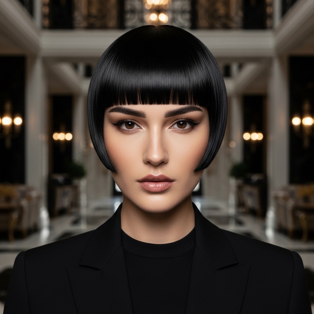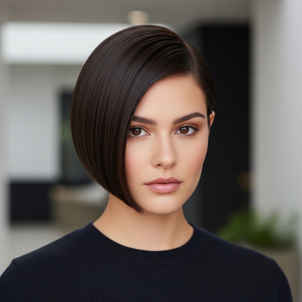This sleek and structured bixie highlights precision cutting techniques, with clean lines and a glossy black finish. The shape is carefully sculpted to frame the jawline, creating a sharp and sophisticated silhouette.