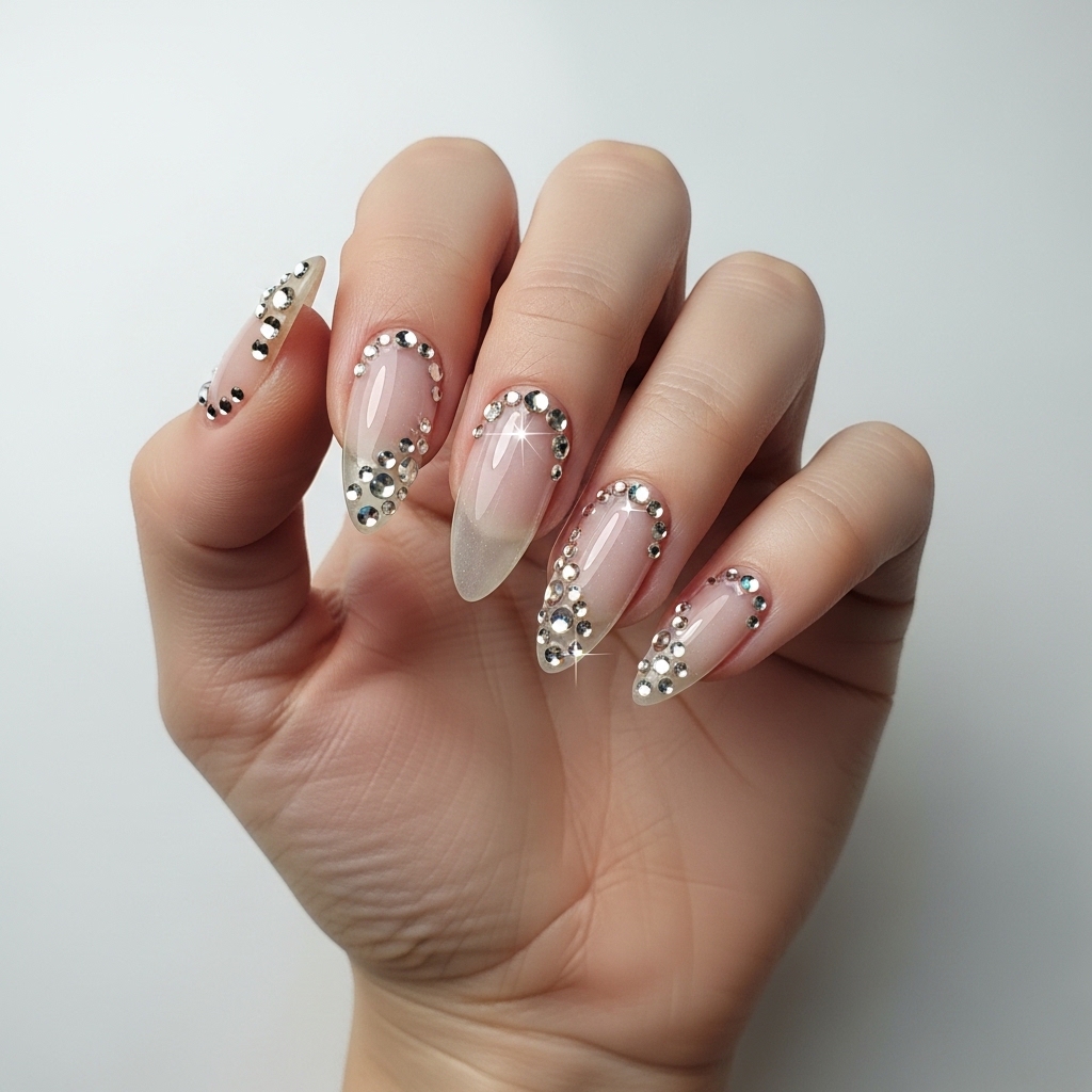 A clear or pale base adorned with tiny crystal-like droplets creates a fresh, dewy effect. The placement mimics water droplets, adding dimension without heaviness. This design is perfect for special occasions or when you want a subtle statement. The carefully placed accents maintain comfort, while the glossy finish enhances the overall luminous look.