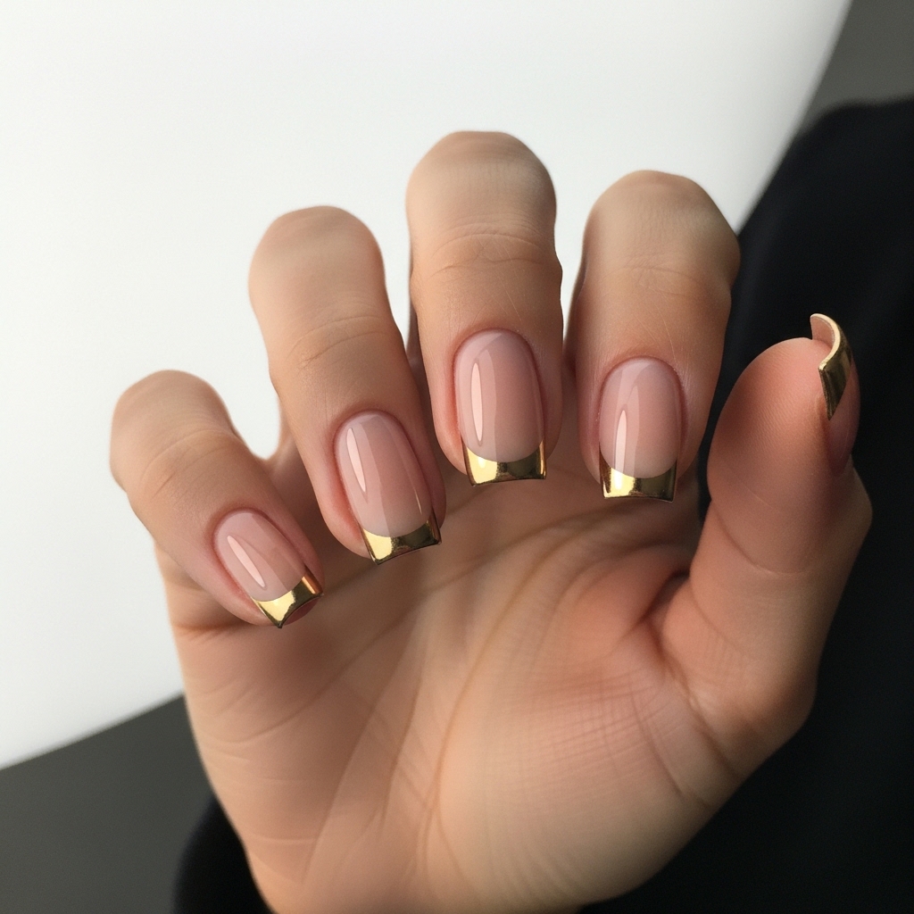 A refined update on the classic French manicure, this design replaces traditional white tips with ultra-thin metallic lines in gold, chrome, or rose gold. The base remains nude or milky, allowing the metallic edge to stand out subtly. It works beautifully in professional settings and evening occasions alike. The slim detailing keeps the nails lightweight and practical while still delivering a polished, fashion-forward appearance.