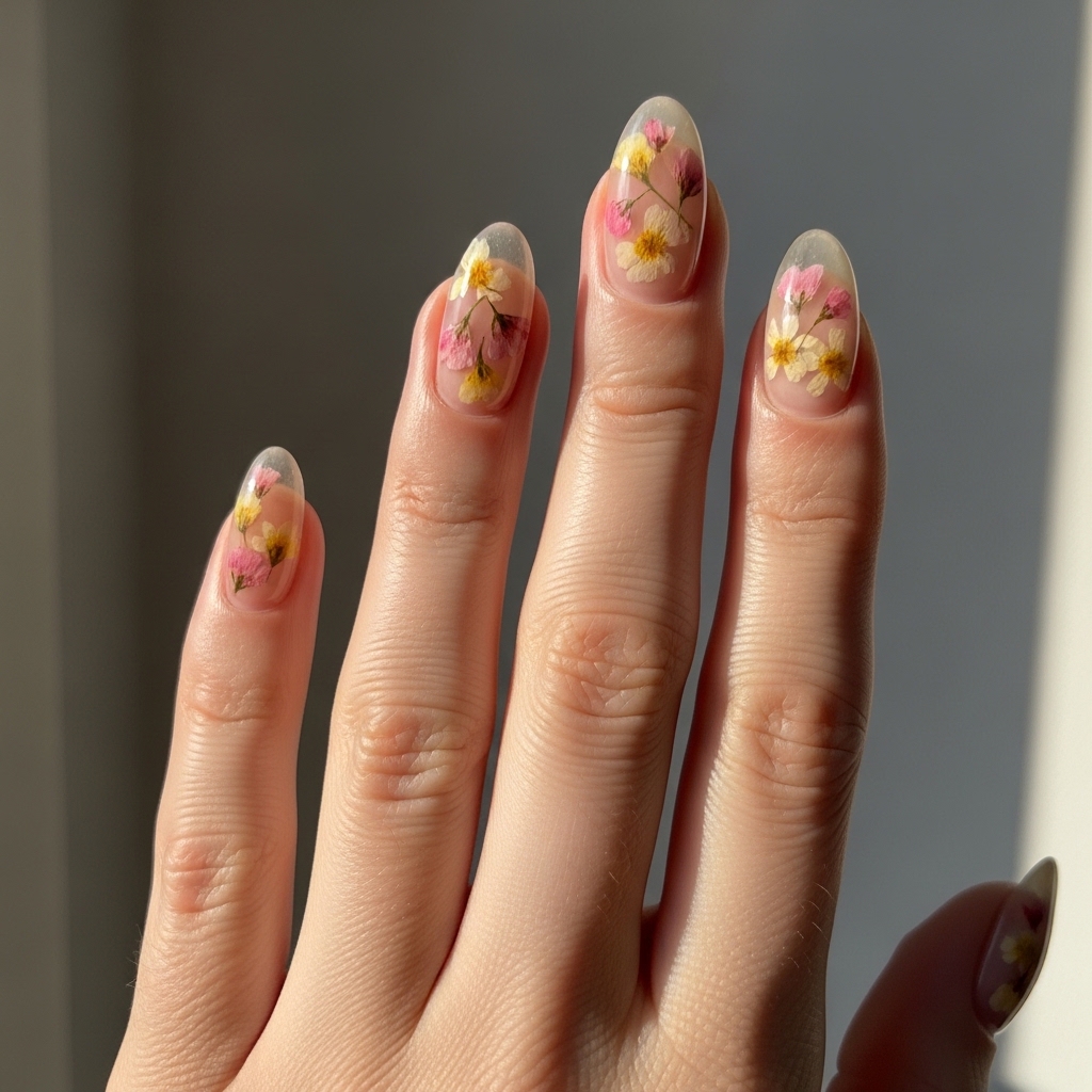 Inspired by nature, this design incorporates tiny dried or painted floral elements embedded into a clear or nude base. Each nail can feature different floral arrangements, creating a delicate garden-like effect. It is ideal for outdoor gatherings, picnics, or spring celebrations. The design feels airy and light, and when sealed properly, it remains smooth and comfortable for everyday wear.