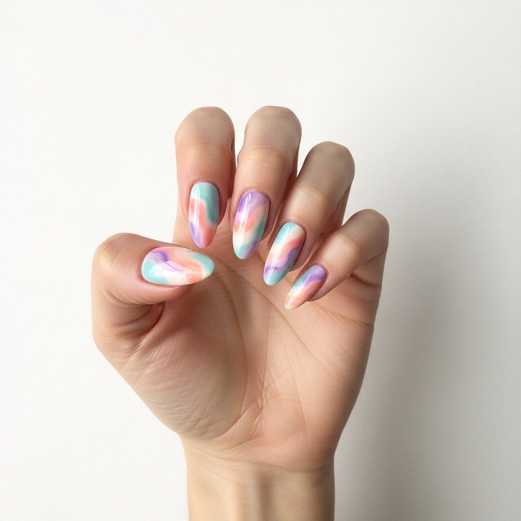 This artistic design blends multiple soft hues into fluid, watercolor-like swirls across each nail. Colors such as peach, lilac, and sky blue merge effortlessly, creating a unique pattern on every finger. Perfect for creative personalities and casual outings, it brings an expressive yet refined vibe. The design remains wearable due to its soft palette and smooth finish, striking a balance between art and elegance.