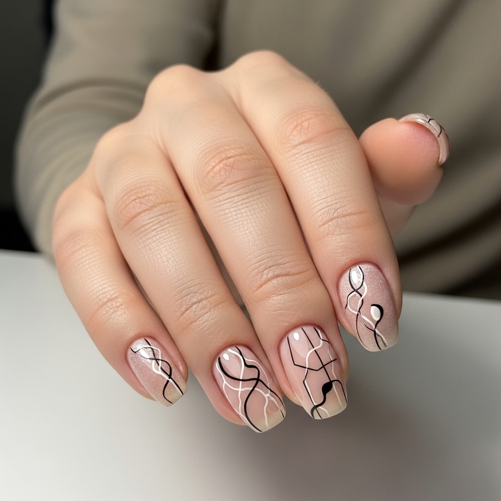 A nude or beige base paired with fine black or white line art creates a modern, minimalist aesthetic. Designs may include abstract shapes, curves, or geometric lines. It is highly versatile and works in both professional and social settings. The simplicity ensures comfort and practicality, while the artistic detail adds a contemporary edge that feels effortlessly stylish.