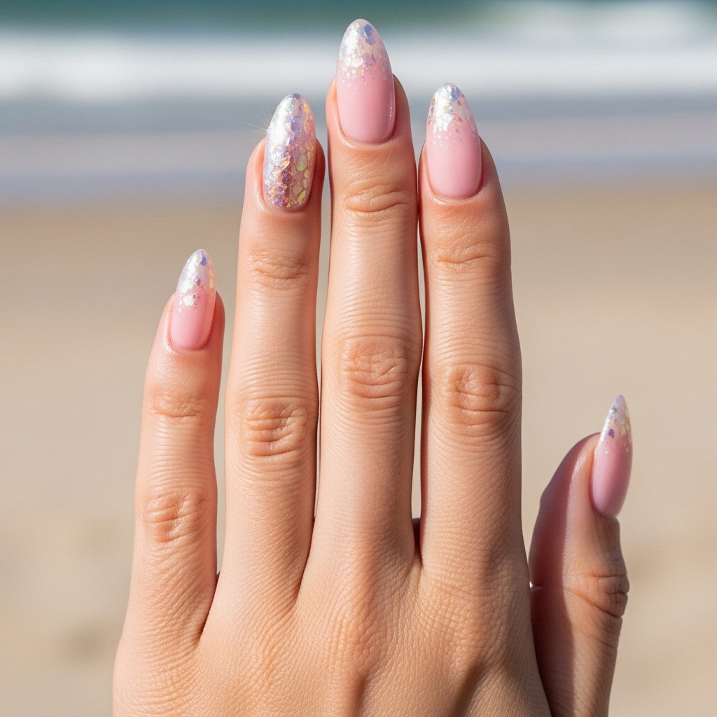 Inspired by seashell reflections, this design features iridescent powders layered over soft bases to create a multi-tonal shimmer. Colors shift subtly under light, giving a luminous ocean-inspired effect. Ideal for vacations and summer evenings, it offers a glamorous touch without heavy decoration. The smooth, polished surface ensures both comfort and durability.