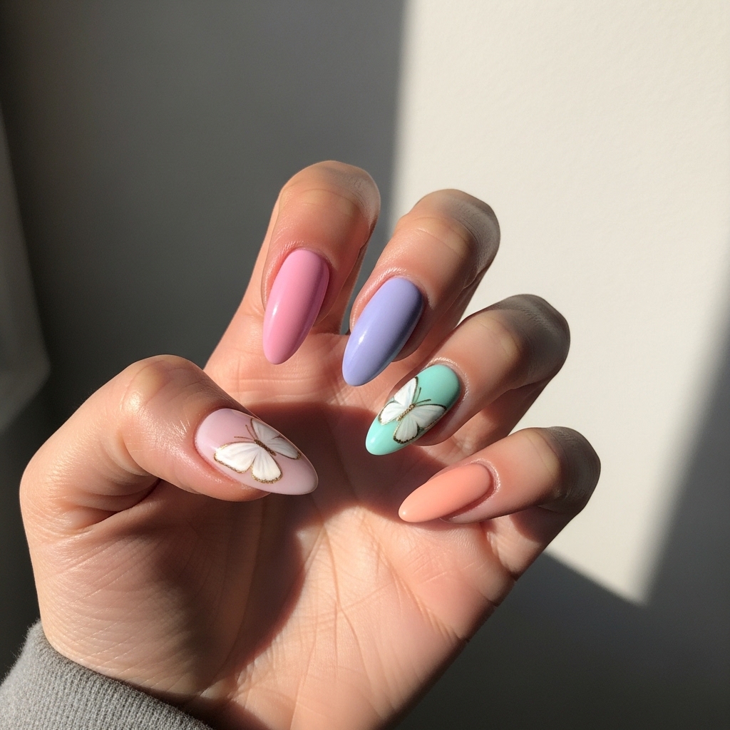 It is ideal for spring celebrations, weekend gatherings, and creative environments. The pastel tones keep the manicure light and wearable, while the butterfly art adds artistic charm. The glossy finish ensures the nails appear polished and smooth, balancing trendiness with everyday comfort.