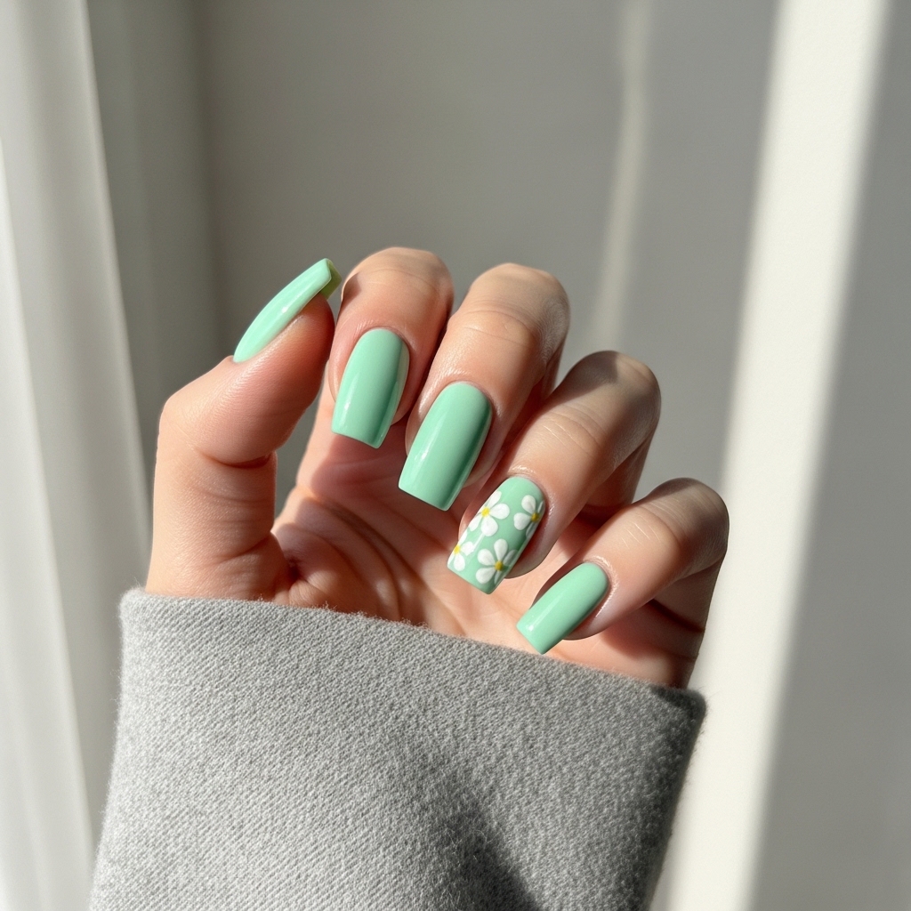 This design works well for casual outings, office environments, and spring events. The mint tone feels refreshing while the minimal flowers add seasonal detail. The overall layout ensures the manicure remains wearable and comfortable.