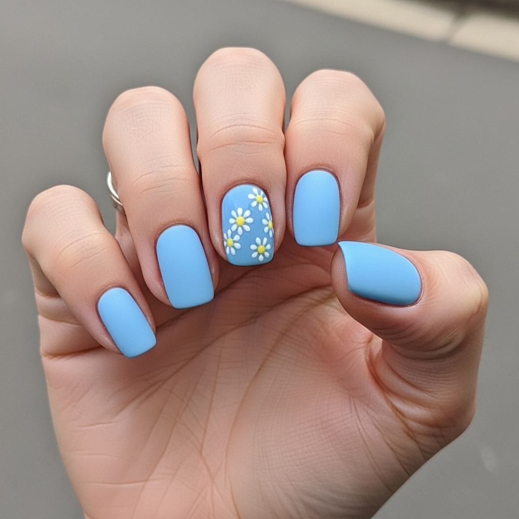 Pastel Daisy Accent Nails combine a soft pastel base such as baby blue or lavender with tiny hand painted daisy details on one or two nails. The rest remain solid pastel shades.