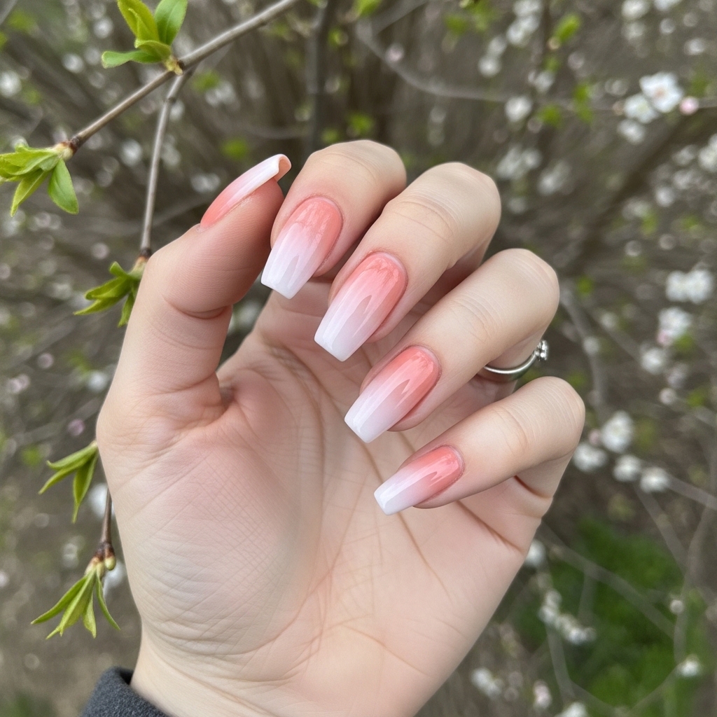 This design transitions smoothly from a soft peach shade at the base to a lighter pastel tone at the tips. The ombre effect creates depth and dimension while maintaining a delicate appearance.