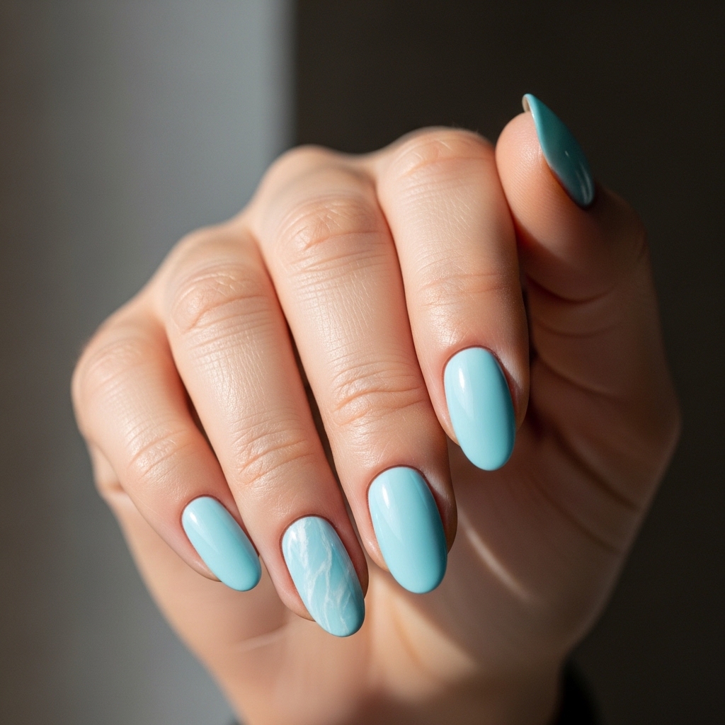 Baby Blue Marble Dream nails feature a soft pastel blue base with subtle white marble swirls. The marble effect is delicate and blended for a refined aesthetic.