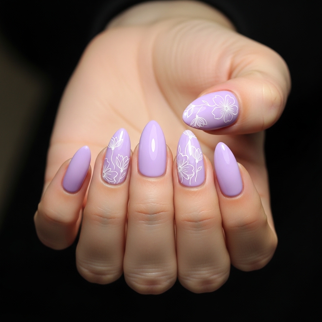 Lilac Floral Line Art combines a pastel lilac base with thin white line drawings of flowers on accent nails. The artwork remains minimal and elegant.
