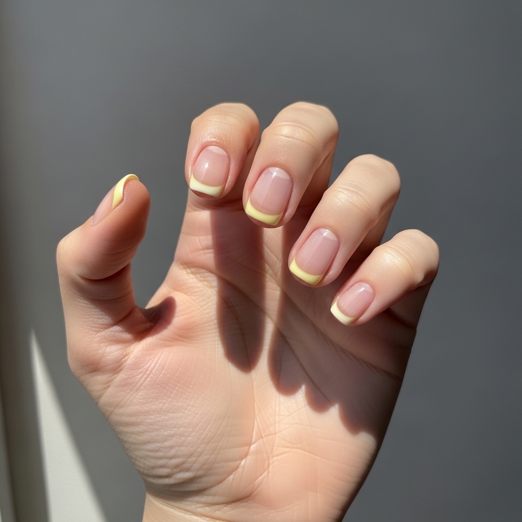 Soft Yellow Sunshine Tips feature a nude pastel base with thin pastel yellow tips instead of classic white. The design keeps the French manicure structure but updates the color palette.