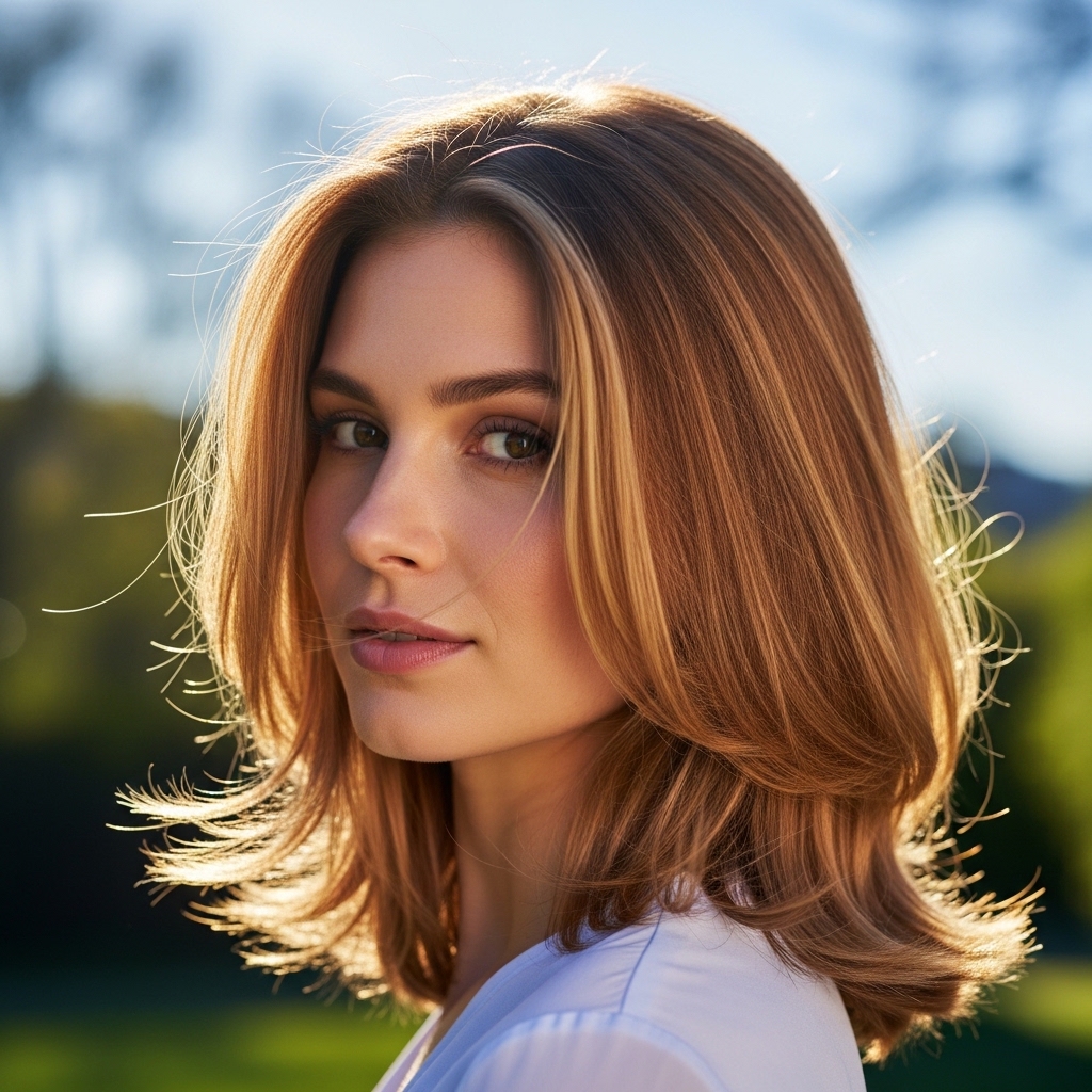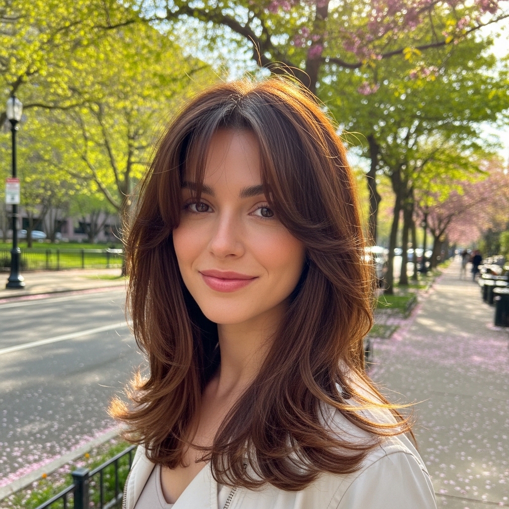 Soft layered hair enhanced with subtle highlights adds depth and brightness to spring hairstyles. The layers create gentle movement while the highlights reflect natural sunlight.