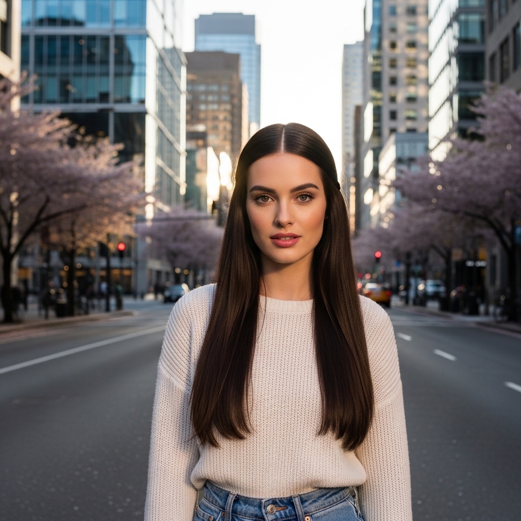 Long straight hair with a clean center part creates a timeless and elegant look. The hair falls smoothly with subtle layers for movement.