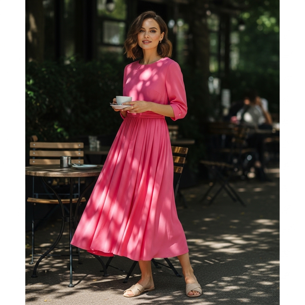A Bubblegum Pink Brunch Dress instantly sets a cheerful, feminine tone for spring mornings. This look typically features a flowy midi or mini dress in a soft yet vibrant pink hue, paired with flat or low-heeled comfy sandals. The silhouette is light and breathable, making it ideal for sunny outdoor brunch spots.