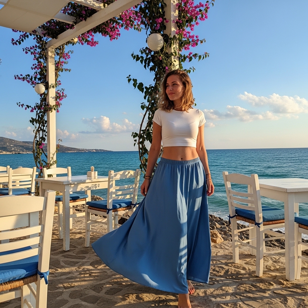 A White Crop Top paired with a Sky-Blue Maxi Skirt creates a soft, flowing silhouette that feels both relaxed and glamorous.