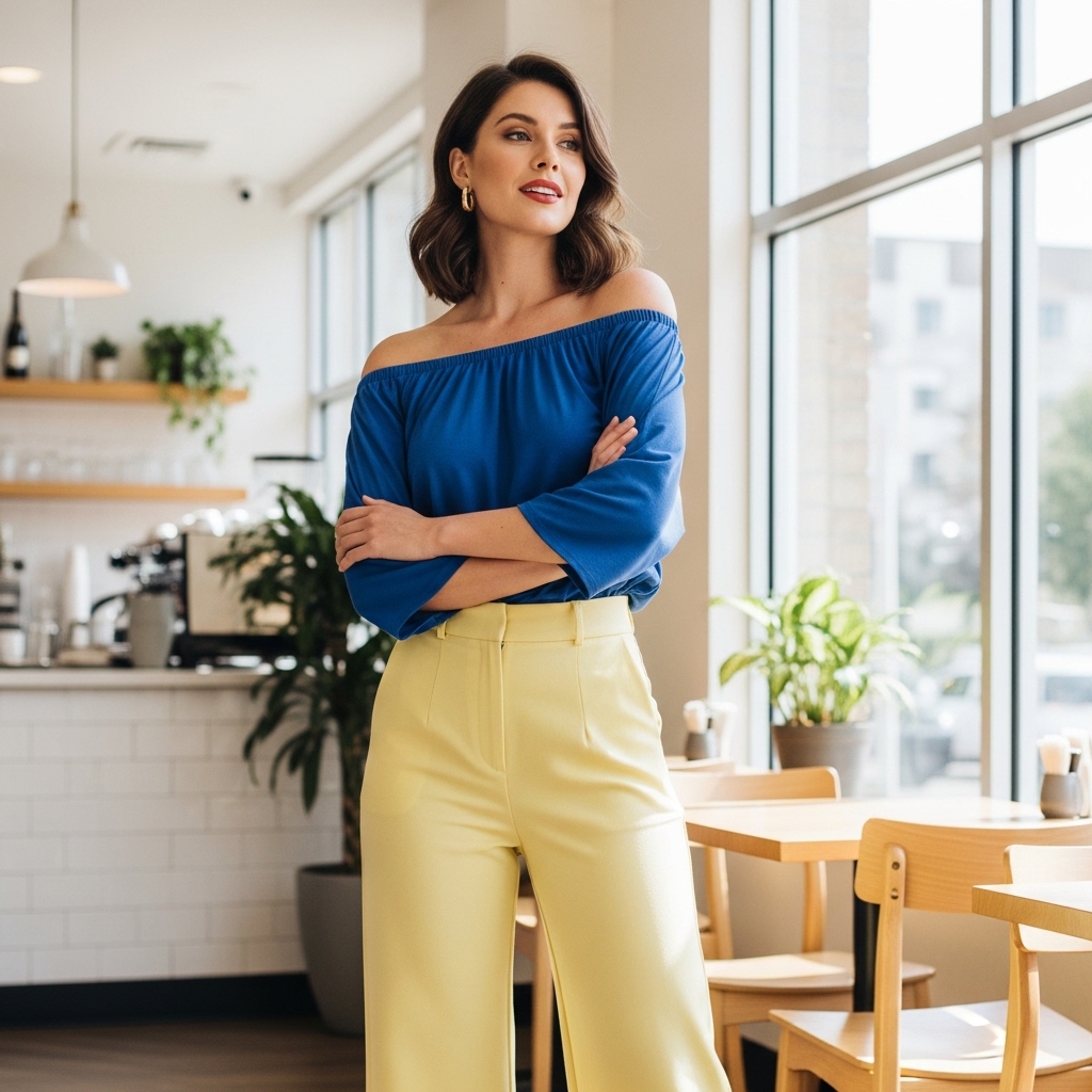 An Off-Shoulder Blue Top with Pastel Wide-Leg Pants offers a modern, fashion-forward brunch look. The off-shoulder detail adds softness, while the wide-leg pants bring structure.