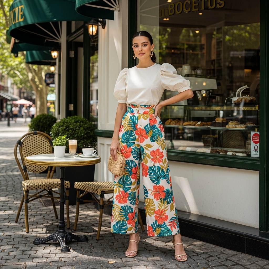 A Puff-Sleeve Top paired with Floral Wide-Leg Pants creates a bold yet balanced brunch outfit. The volume on top complements the flow of the pants.