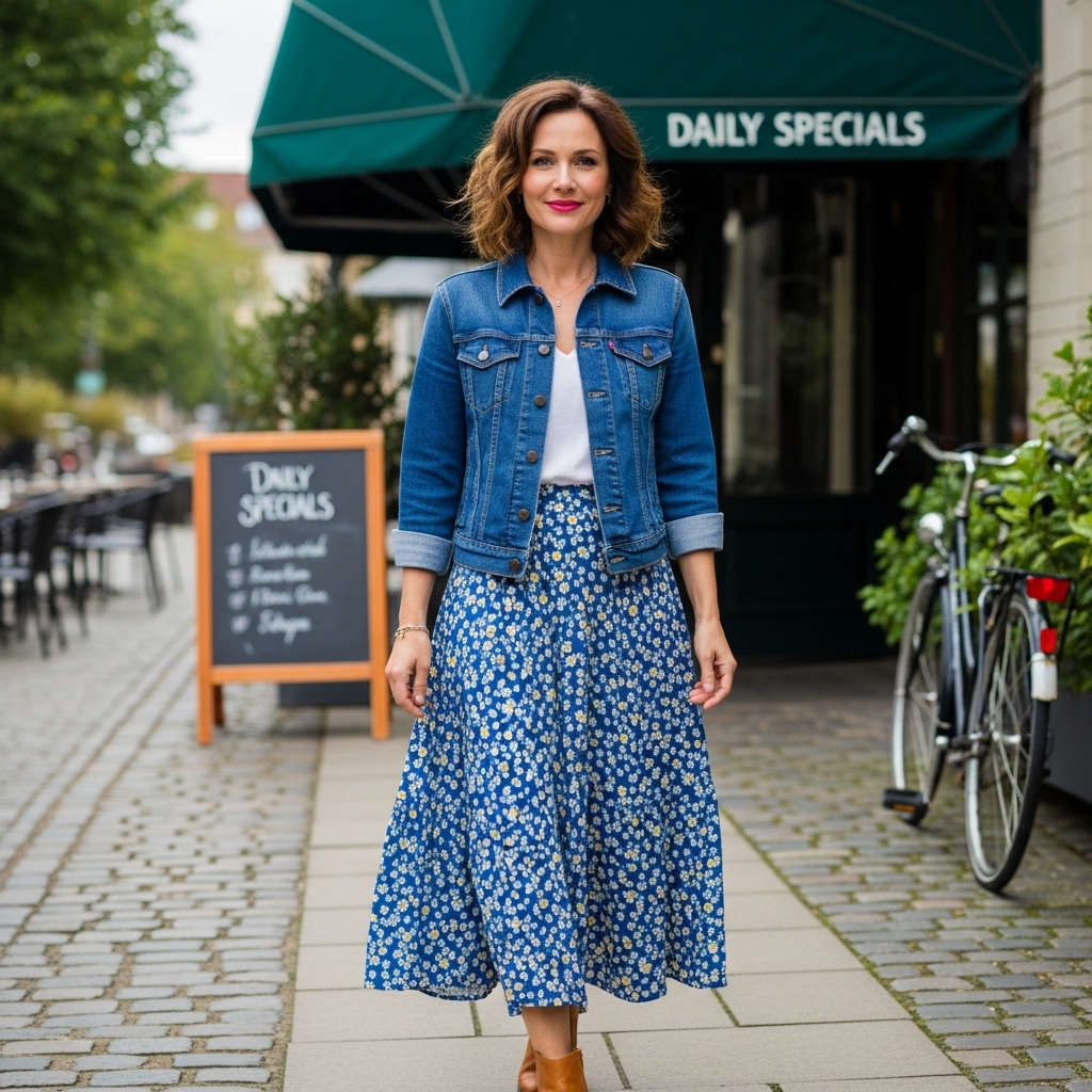 A Denim Jacket layered over a Blue Floral Midi Skirt is perfect for cooler spring mornings. The jacket adds structure while the skirt keeps the look soft.