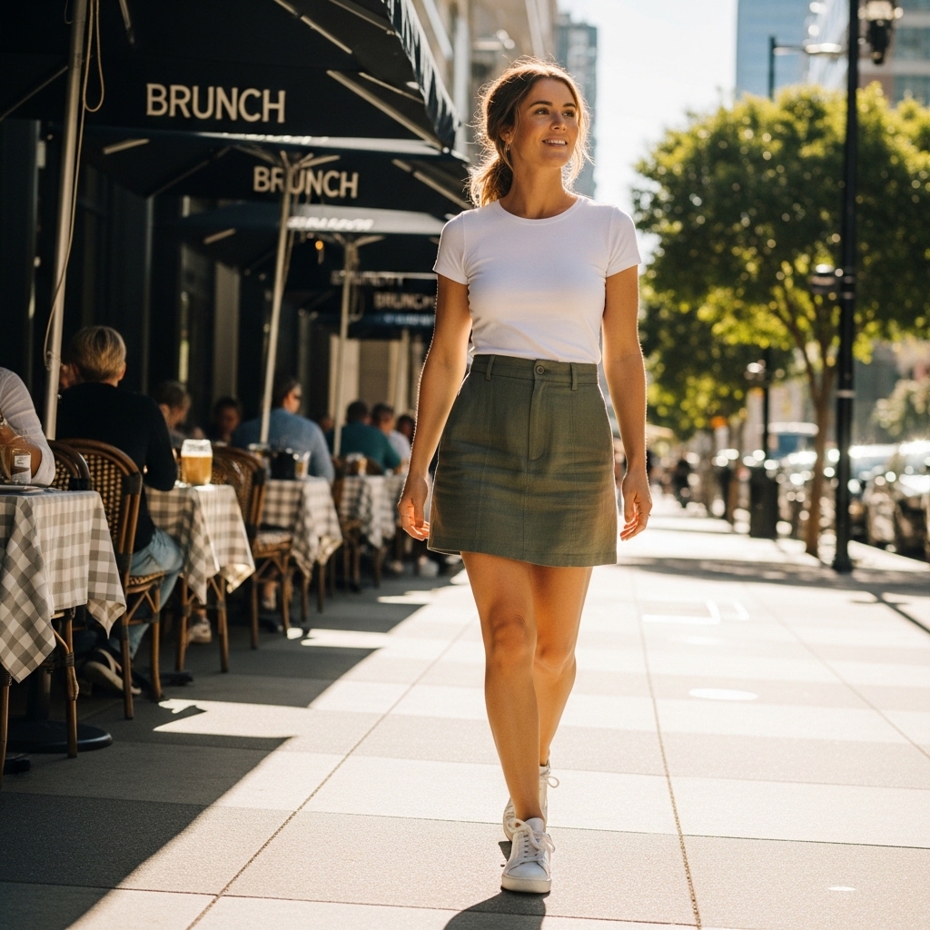 This outfit works beautifully for casual brunch outings, especially in urban settings. The mini skirt adds a youthful edge, while the tee keeps things grounded and comfortable. Together, they create a look that feels effortless yet thoughtfully styled.