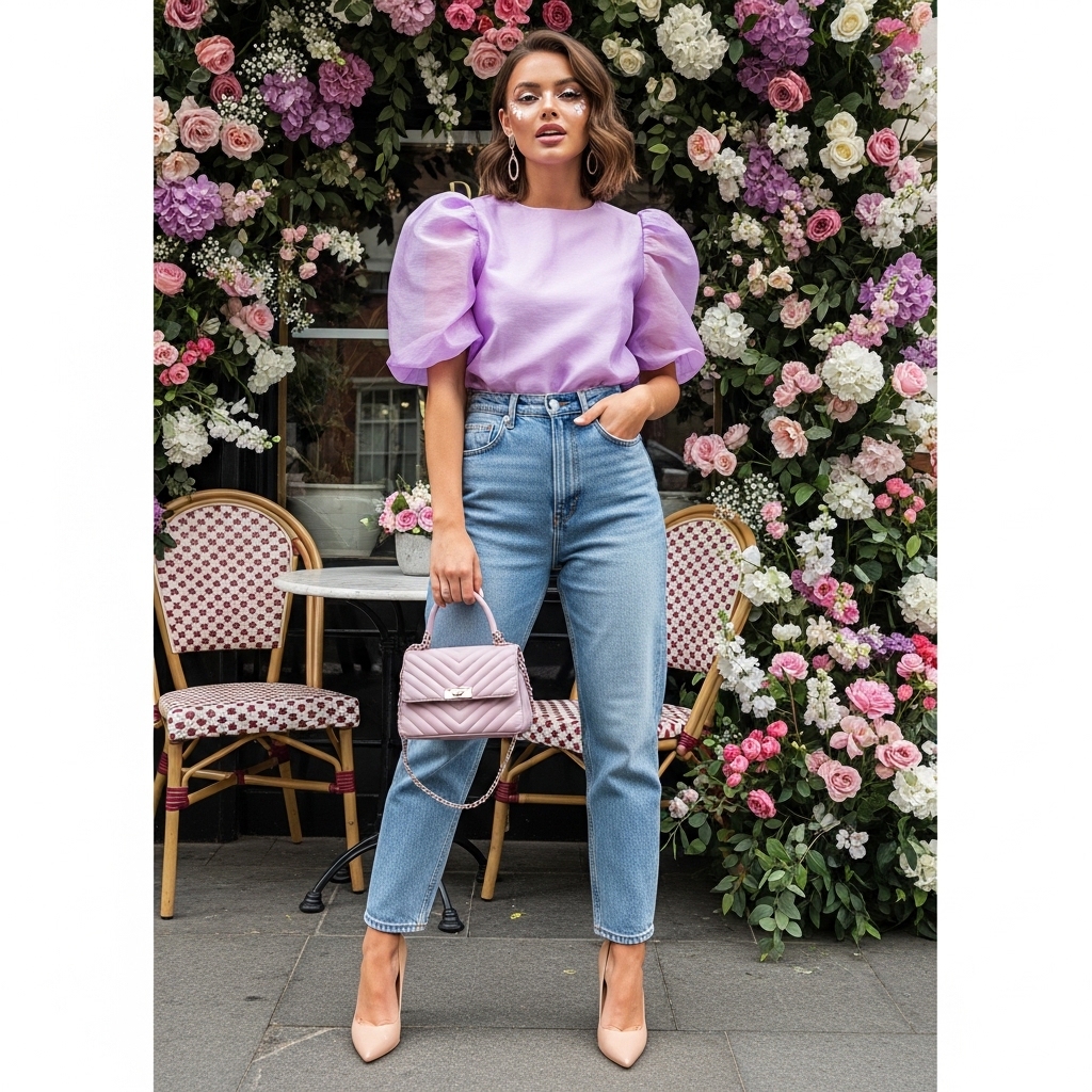 A Lavender Statement Top paired with Light Denim creates a soft, dreamy brunch look. The pastel tone feels fresh and feminine, while the statement details like puff sleeves or textured fabric elevate the outfit.