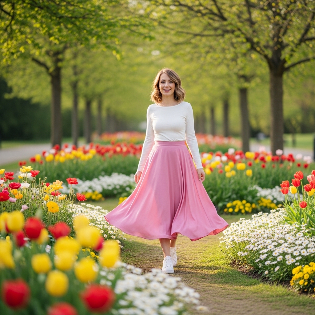 This outfit works well for longer outings where comfort matters. The midi skirt flows beautifully while walking, and the sneakers ensure ease throughout the day. It is a perfect blend of elegance and everyday wearability.