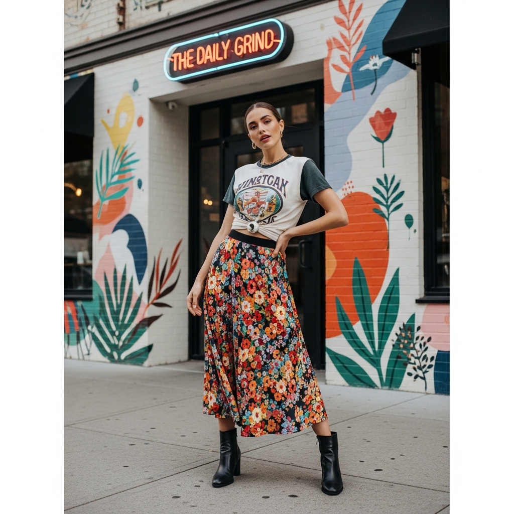 A Graphic Tee styled with a Floral Midi Skirt creates a playful contrast between casual and romantic elements. The tee adds personality, while the skirt brings softness and movement.