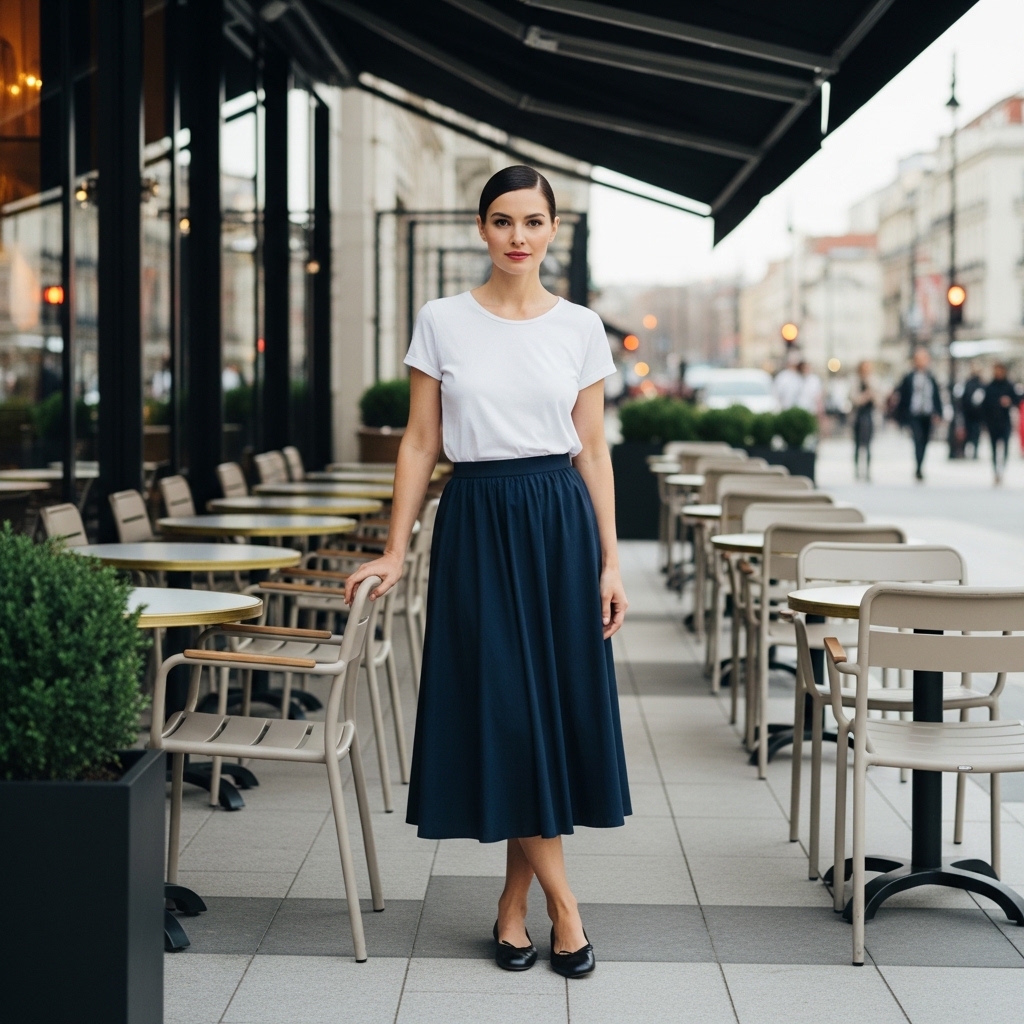 A White Tee paired with a Navy Midi Skirt is a timeless combination that feels polished yet simple. The deep navy adds sophistication, while the tee keeps the look approachable.