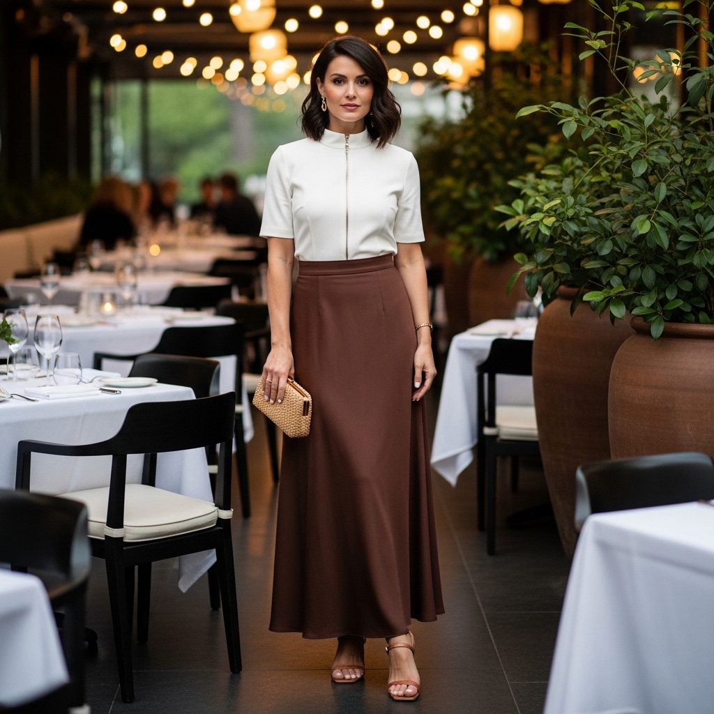 A White Zip Top combined with a Chocolate Maxi Skirt creates a refined, elevated look. The rich brown tone adds depth, while the structured top keeps the outfit modern.