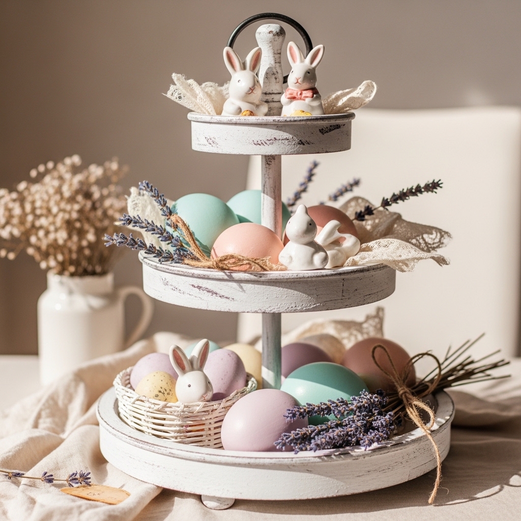 A vintage-inspired tiered tray brings layered storytelling into your decor. This idea includes stacking ceramic bunnies, mini speckled eggs, and tiny florals across a distressed wooden or metal tray. It works beautifully on kitchen counters, coffee tables, or entry consoles where small details can shine.
